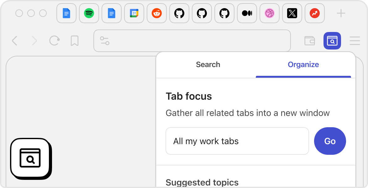 Organize and find tabs for a specific topic, or even gather them in a new window.