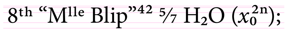 [edit]This image shows the four common locations for subscripts and superscripts, according to their typical uses. The typeface is Minion Pro, set in Adobe Illustrator. Note that the default superscripting algorithms of most word processors would set the "th" and "lle" too high, and the weight of all the subscript and superscript glyphs would be too light.
